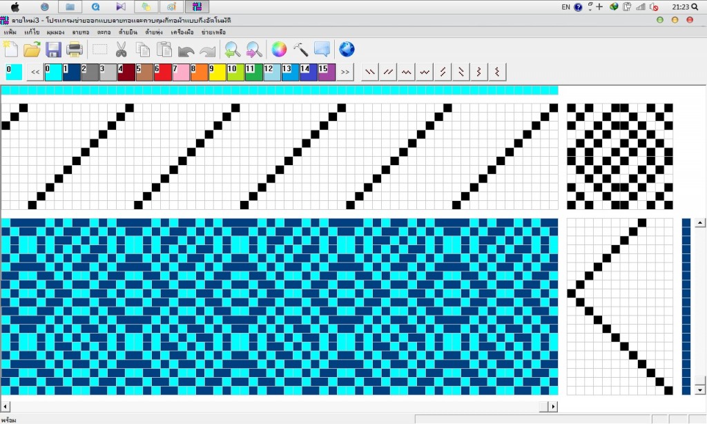 การออกแบบลวดลายทอ ได้แรงบันดาลใจมาจาก เรขาคณิต โดยต้องการสื่อ ถึงเส้นที่มีลักษณะต่างๆกัน ใช้ลายทอแบบเฉียงลง ใช้สี ฟ้า และสีน้ำเงิน ในการทอลายtest3